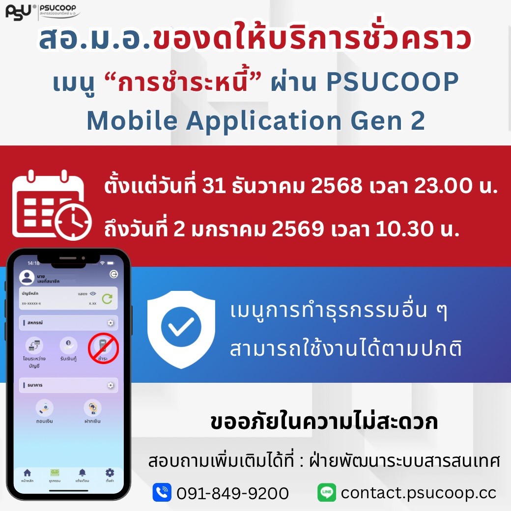 สอ.ม.อ. ของดให้บริการชั่วคราว เมนู "การชำระหนี้" ผ่าน PSUCOOP Mobile Application Gen 2