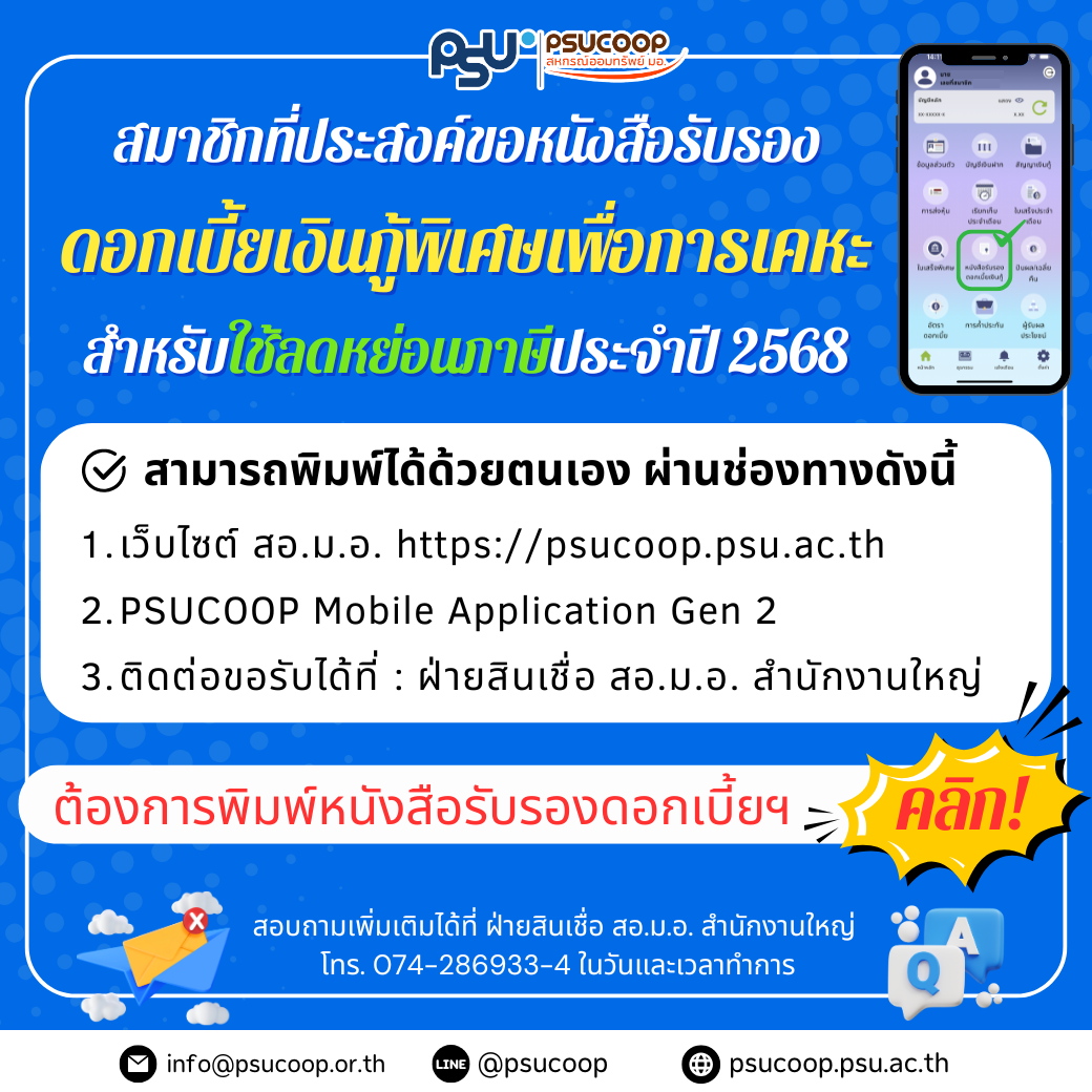 ต้องการพิมพ์หนังสือรับรองดอกเบี้ยฯ คลิก! https://psucoop.psu.ac.th/coop/