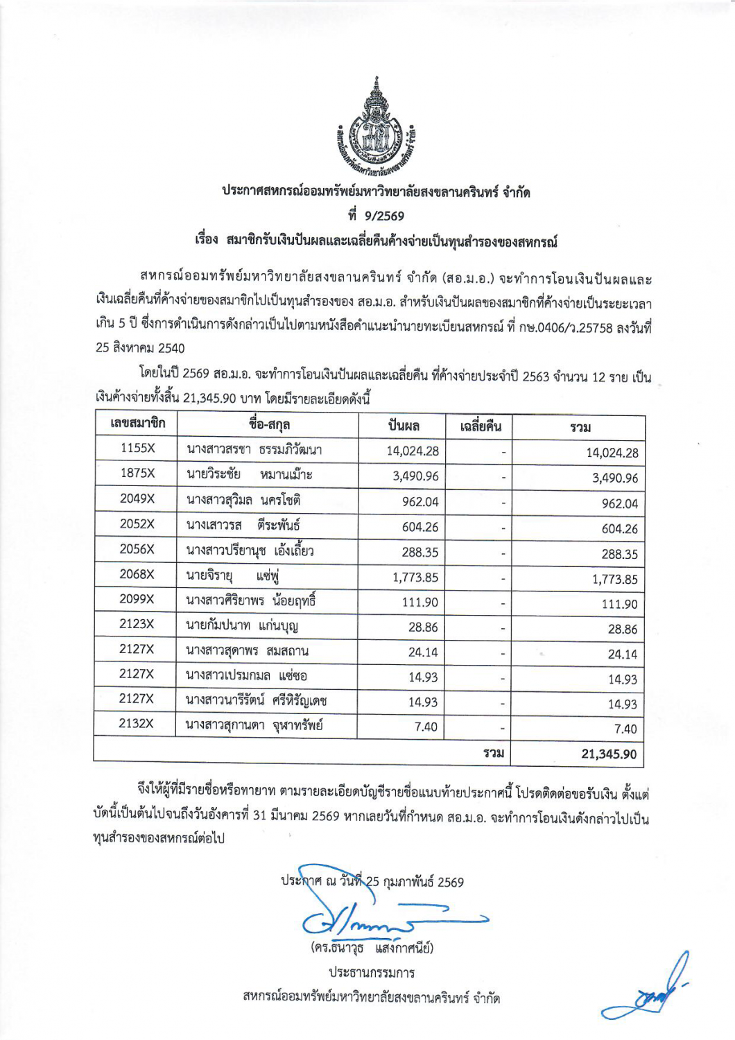 ประกาศ สอ.ม.อ. ที่ 9 - 2569 เรื่อง สมาชิกรับเงินปันผลและเฉลี่ยคืนค้างจ่ายเป็นทุนสำรองของสหกรณ์