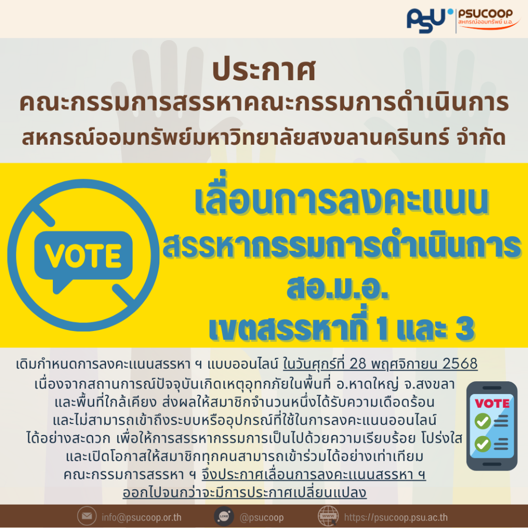ประกาศฯ เลื่อนการลงคะแนนสรรหากรรมการดำเนินการ สอ.ม.อ. เขตสรรหาที่ 1 และ 3