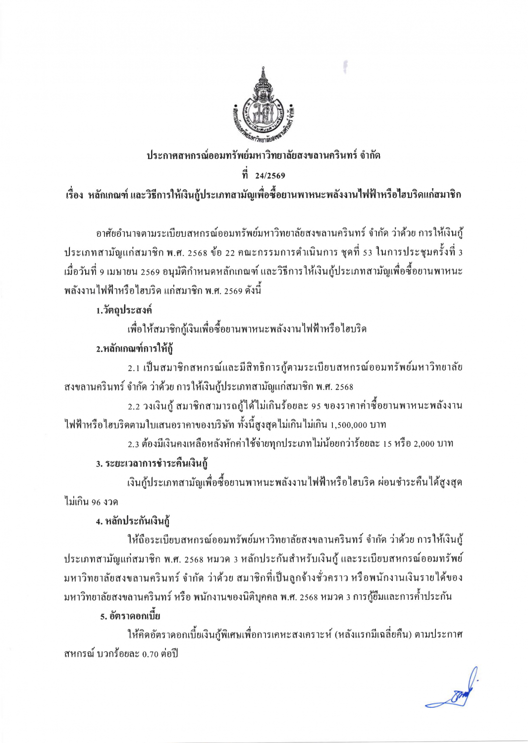 ประกาศ สอ.ม.อ. ที่ 24-2569 หลักเกณฑ์และวิธีการให้เงินกู้ประเภทสามัญเพื่อซื้อยานพาหนะพลังงานไฟฟ้าหรือไฮบริดแก่สมาชิก