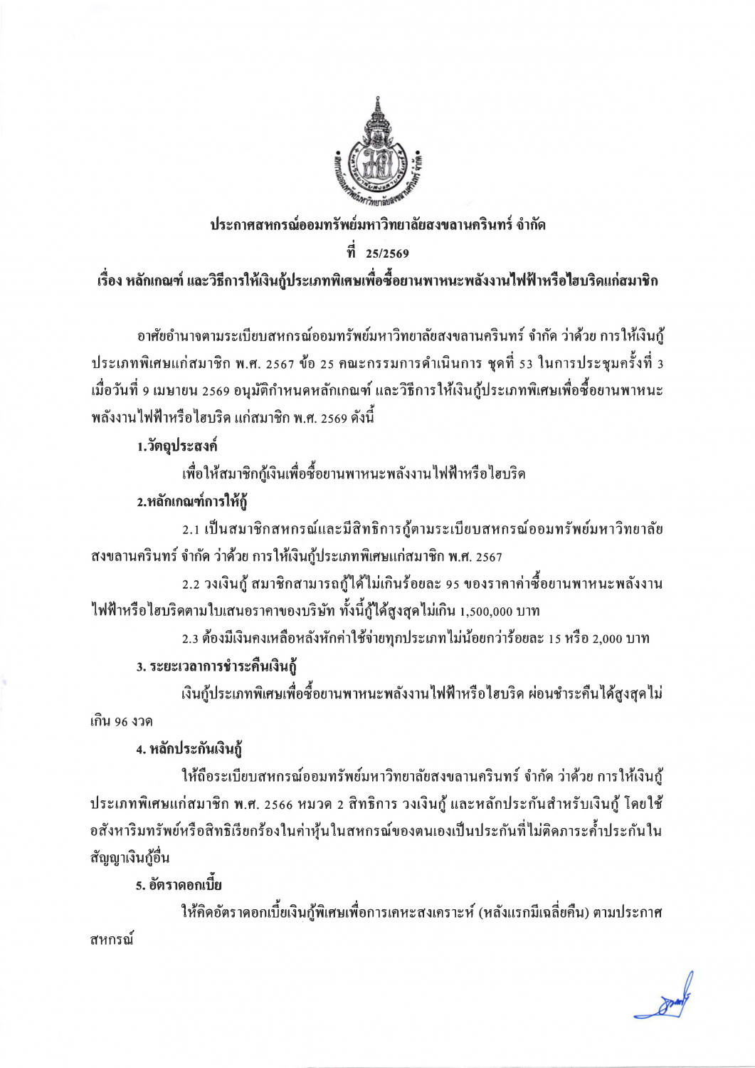 ประกาศ สอ.ม.อ. ที่ 25-2569 หลักเกณฑ์และวิธีการให้เงินกู้ประเภทพิเศษเพื่อซื้อยานพาหนะพลังงานไฟฟ้าหรือไฮบริดแก่สมาชิก