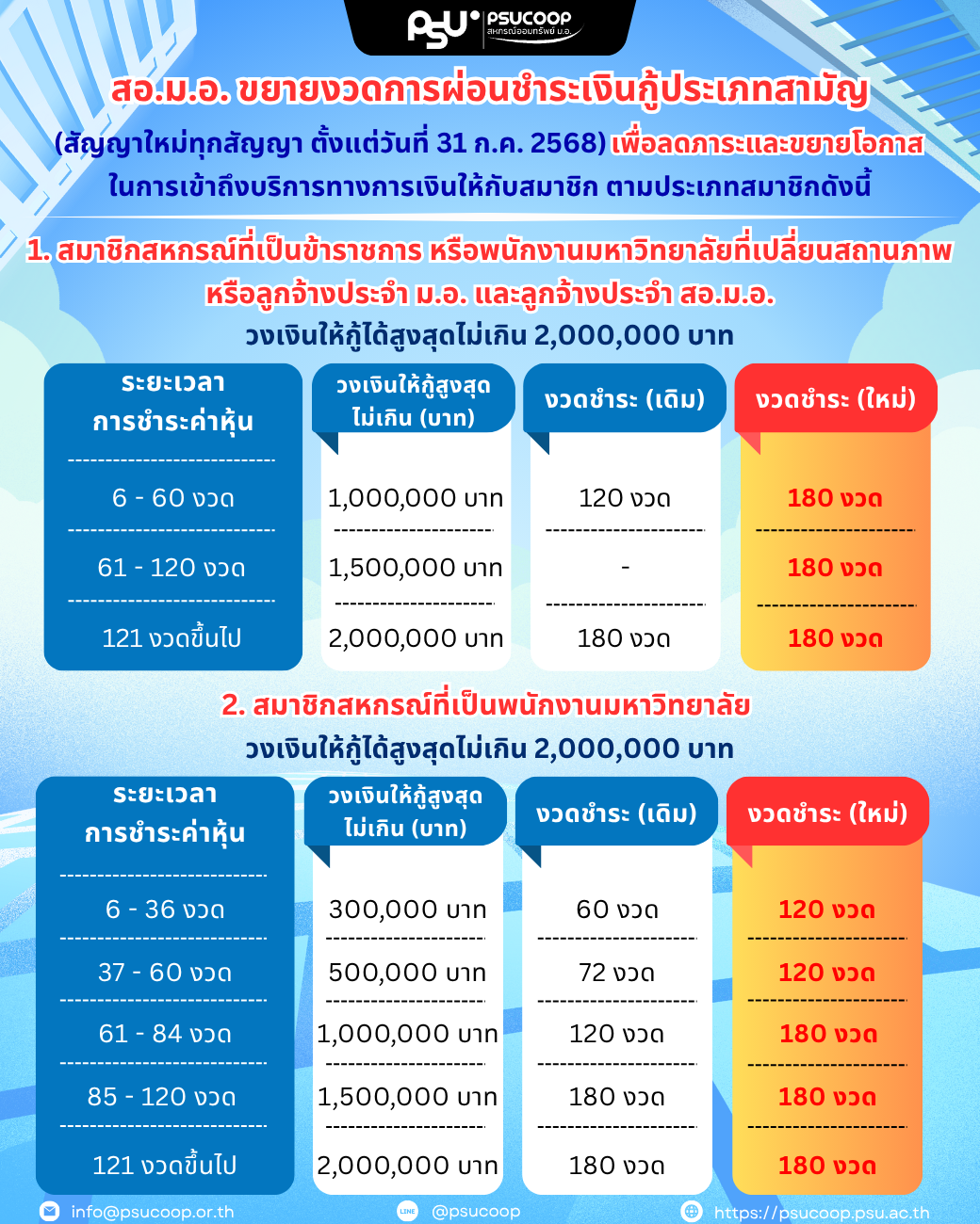สอ.ม.อ. ขยายวงเงินกู้และงวดการผ่อนชำระเงินกู้ประเภทสามัญ สัญญาใหม่ทุกสัญญา ตั้งแต่วันที่ 31 ก.ค. 2568
