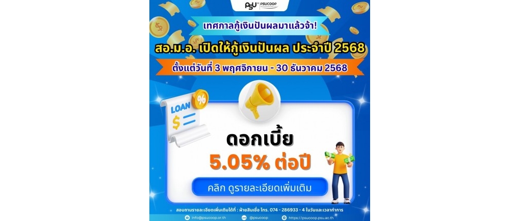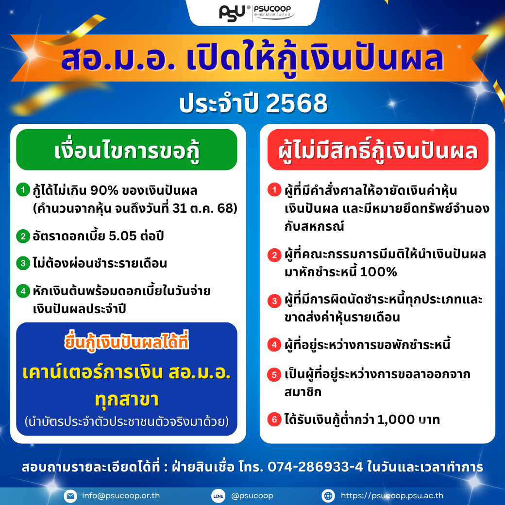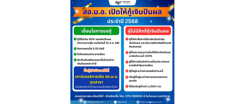 สอ.ม.อ.เปิดให้กู้เงินปันผลประจำปี 2568