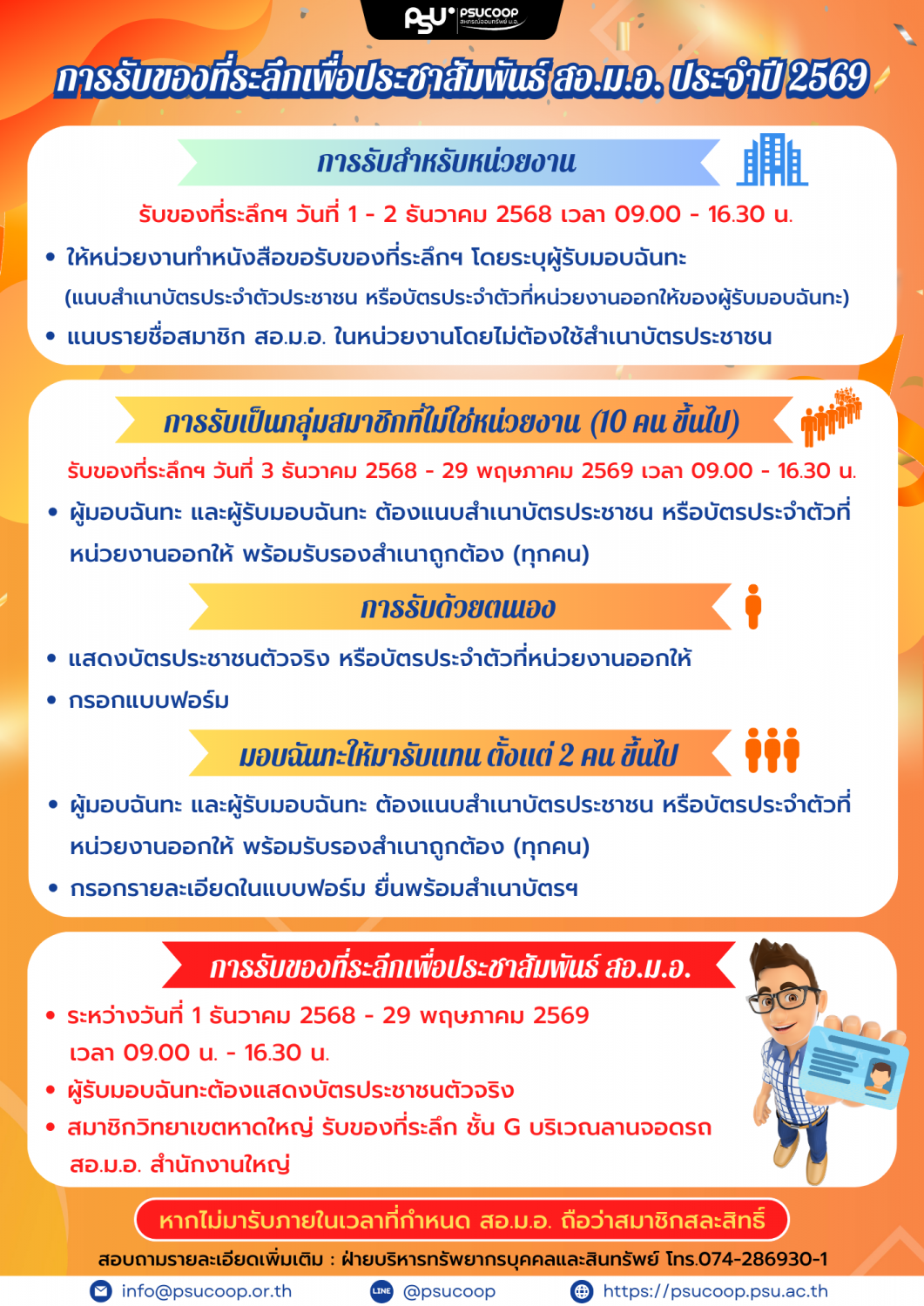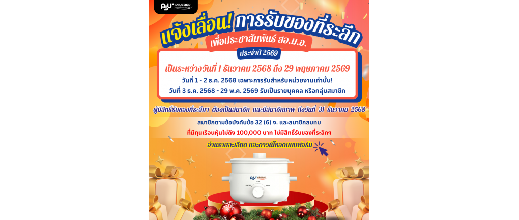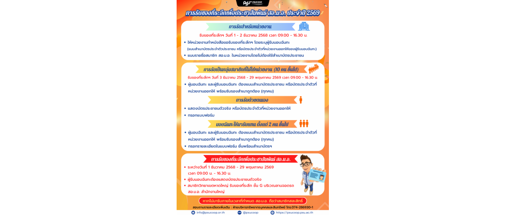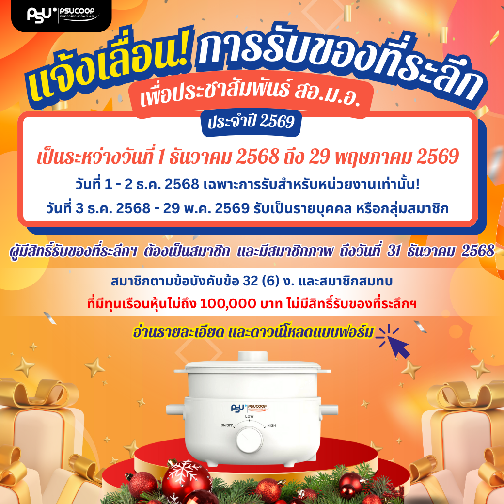 แจ้งเลื่อน การรับของที่ระลึกเพื่อประชาสัมพันธ์ สอ.ม.อ. ประจำปี 2569