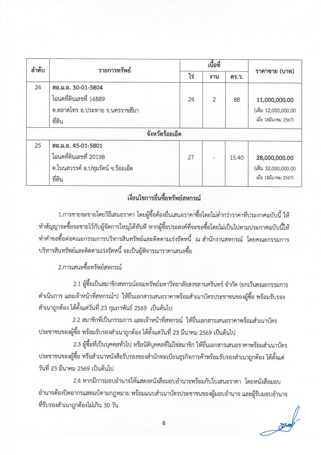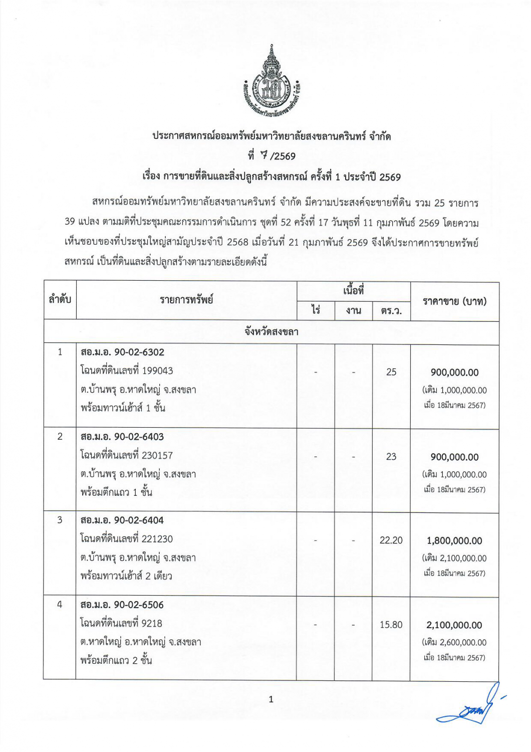 ประกาศ สอ.ม.อ. ที่ 7 - 2569 เรื่อง การขายที่ดินและสิ่งปลูกสร้างสหกรณ์ ครั้งที่ 1 ประจำปี 2569