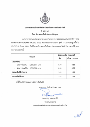 ประกาศ 14-2569 ปรับอัตราดอกเบี้ยเงินฝากออมทรัพย์ มอ.สินทวี