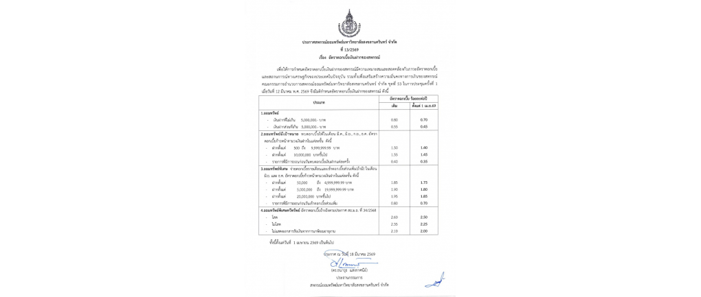 ประกาศปรับอัตราดอกเบี้ยเงินฝาก และอัตราดอกเบี้ยเงินกู้ มีผลตั้งแต่ วันที่ 1 เมษายน 2569 เป็นต้นไป